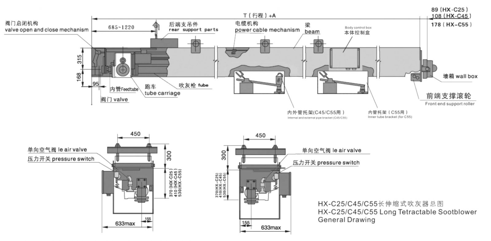 HX-C25/C45/C55 soot blower mainly consists of sports car, poppet valve, beam body, wall box, power cable, front-end support roller, inner tube, soot blower and nozzle, electrical box and stroke control, spiral phase change mechanism Select) composed of inner and outer tube auxiliary brackets, inner tube brackets, etc.